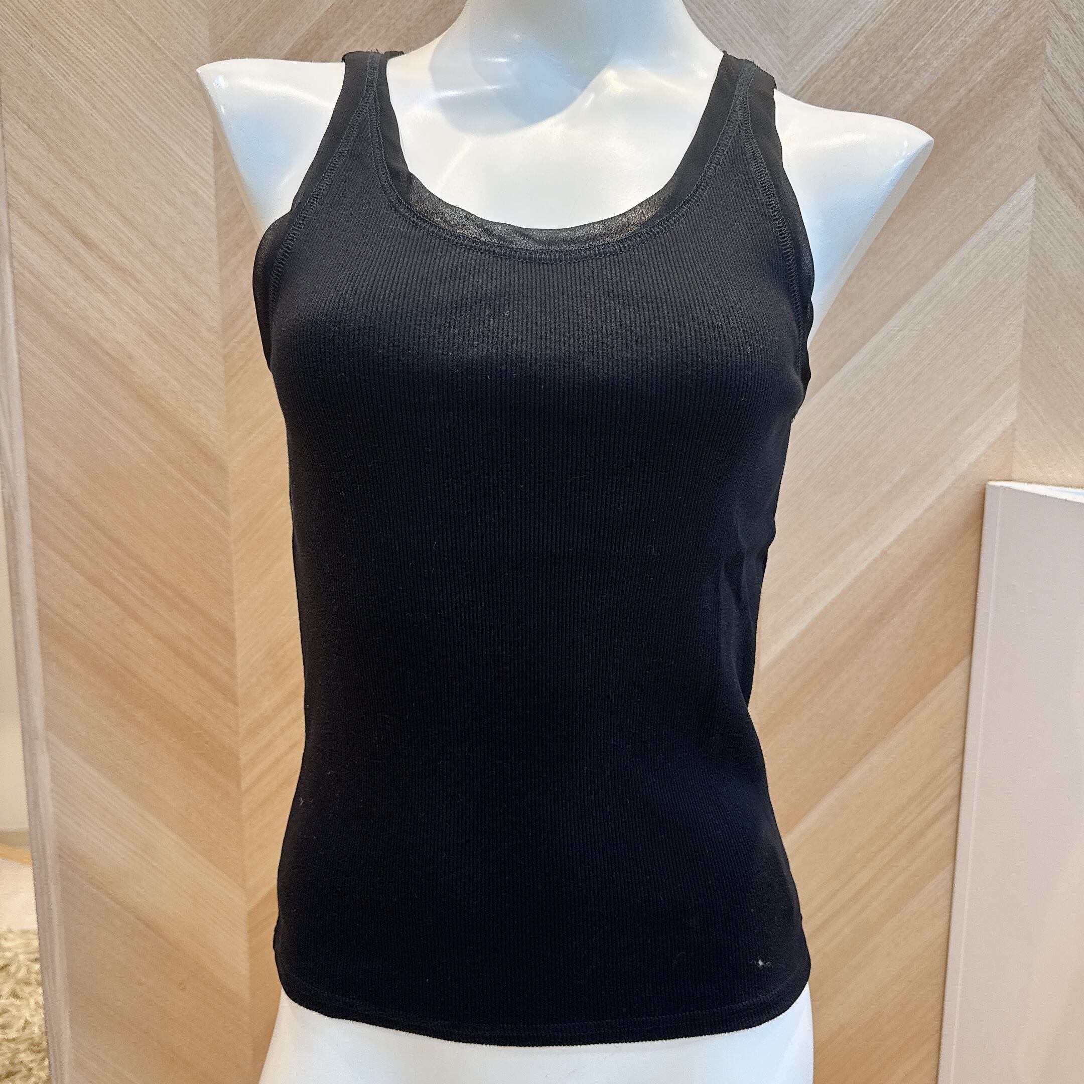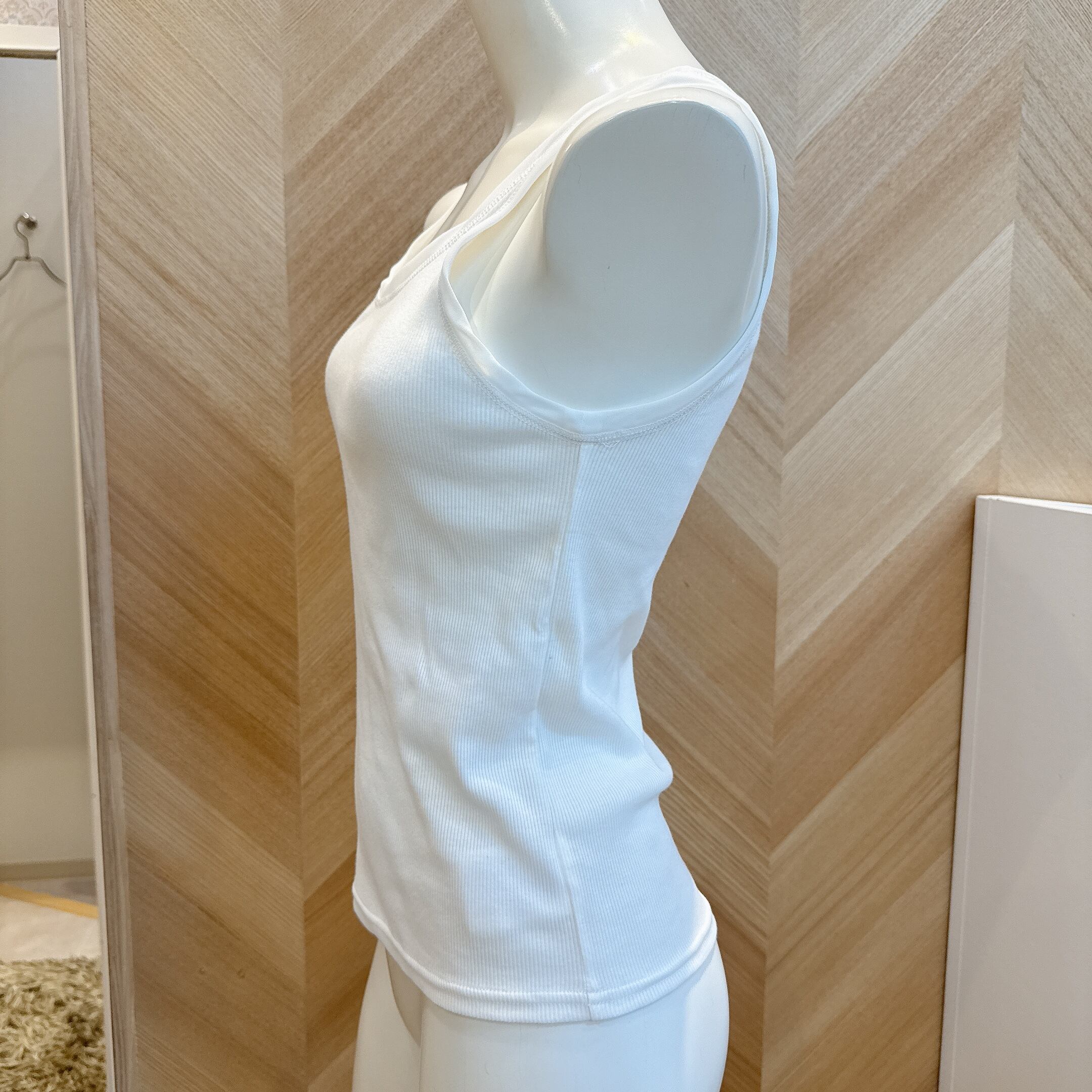 シンプルなタンクトップでありながら、襟ぐりアームにシフォントリムが施され、女性らしさがプラスされた一枚です。
