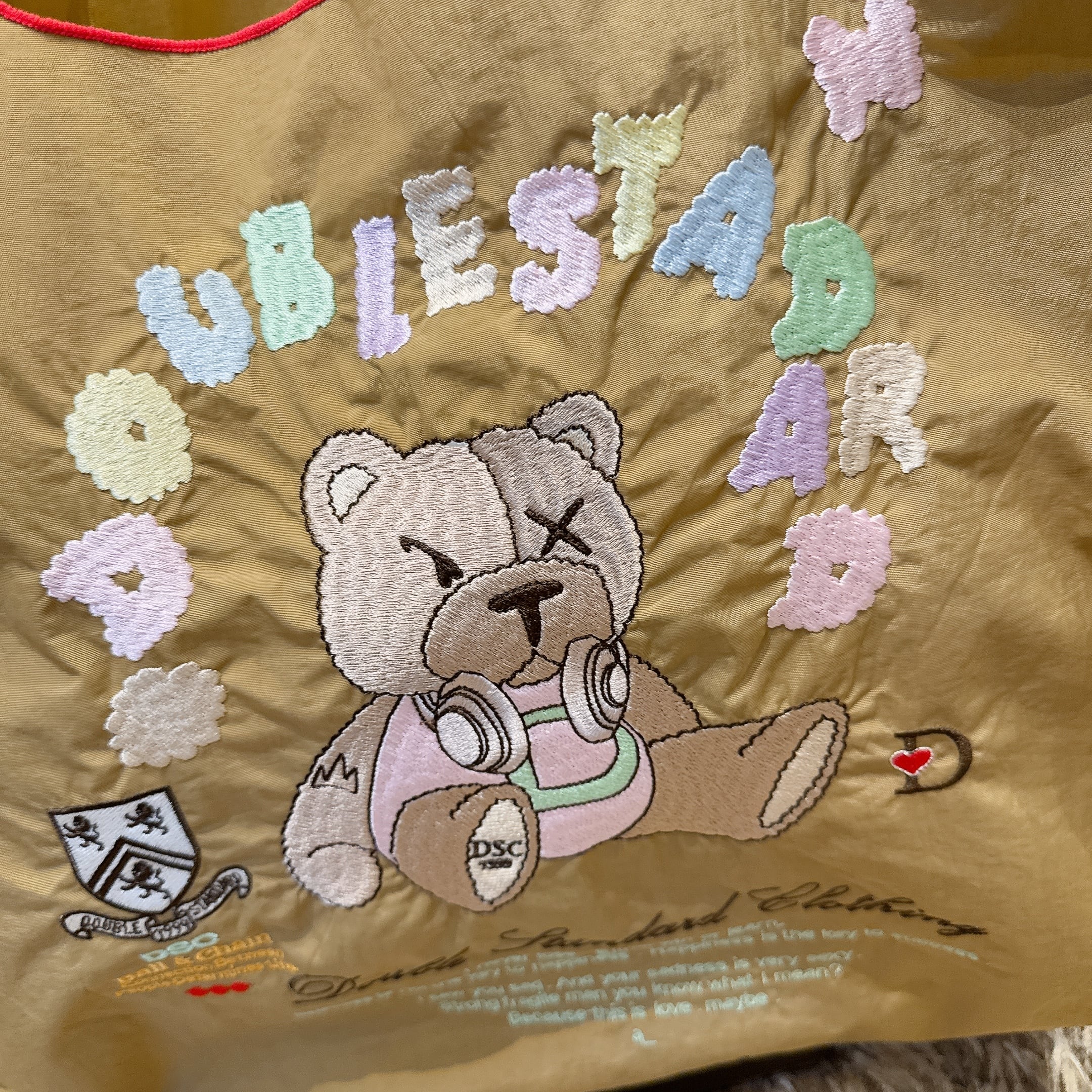 全て刺繍デザインがポイントです。生地には独特のシャリ感があり、小さくたためるのにおしゃれ見えするのが魅力的。ショッピングバッグと言わず、お出かけにいつも連れて行きたくなるアイテムです。