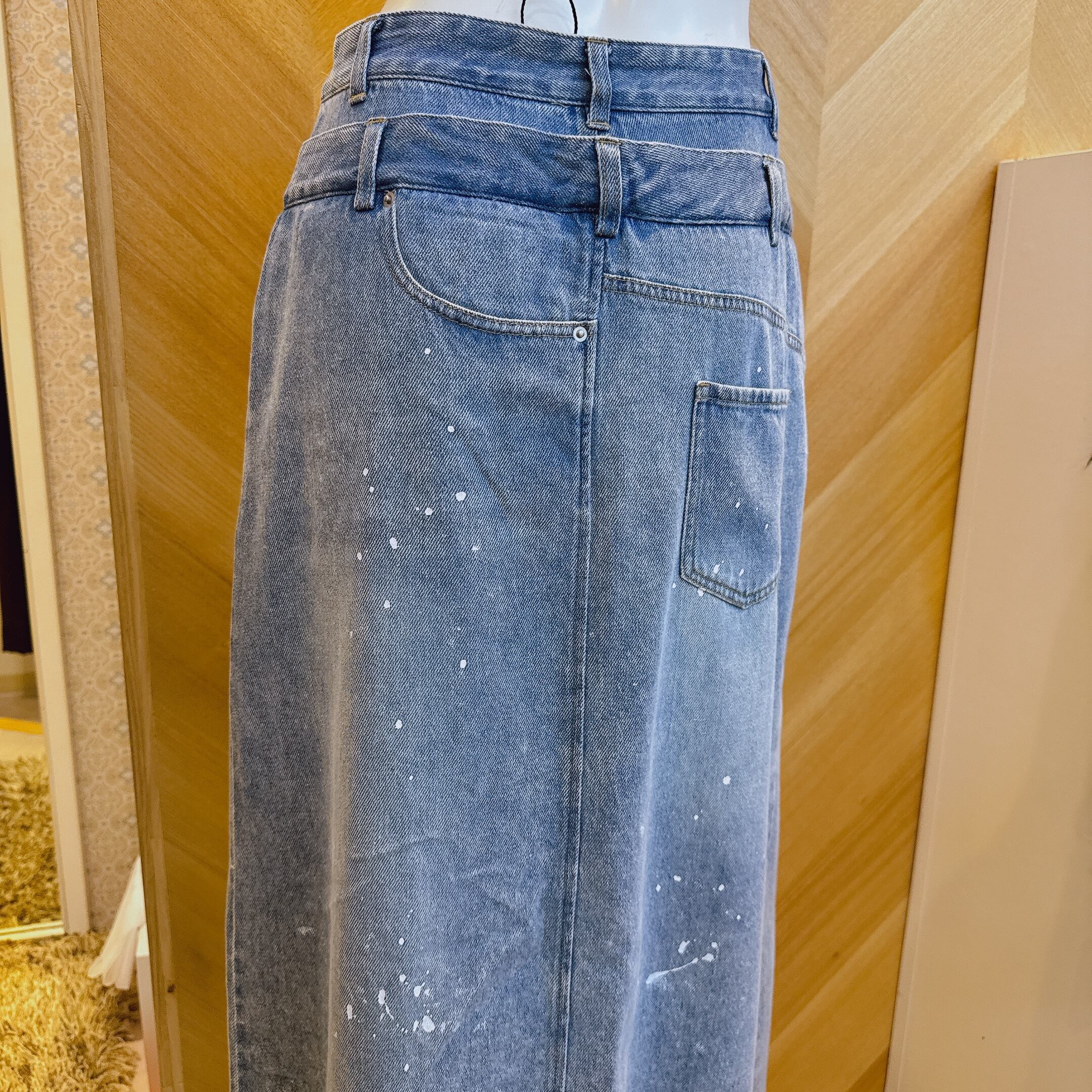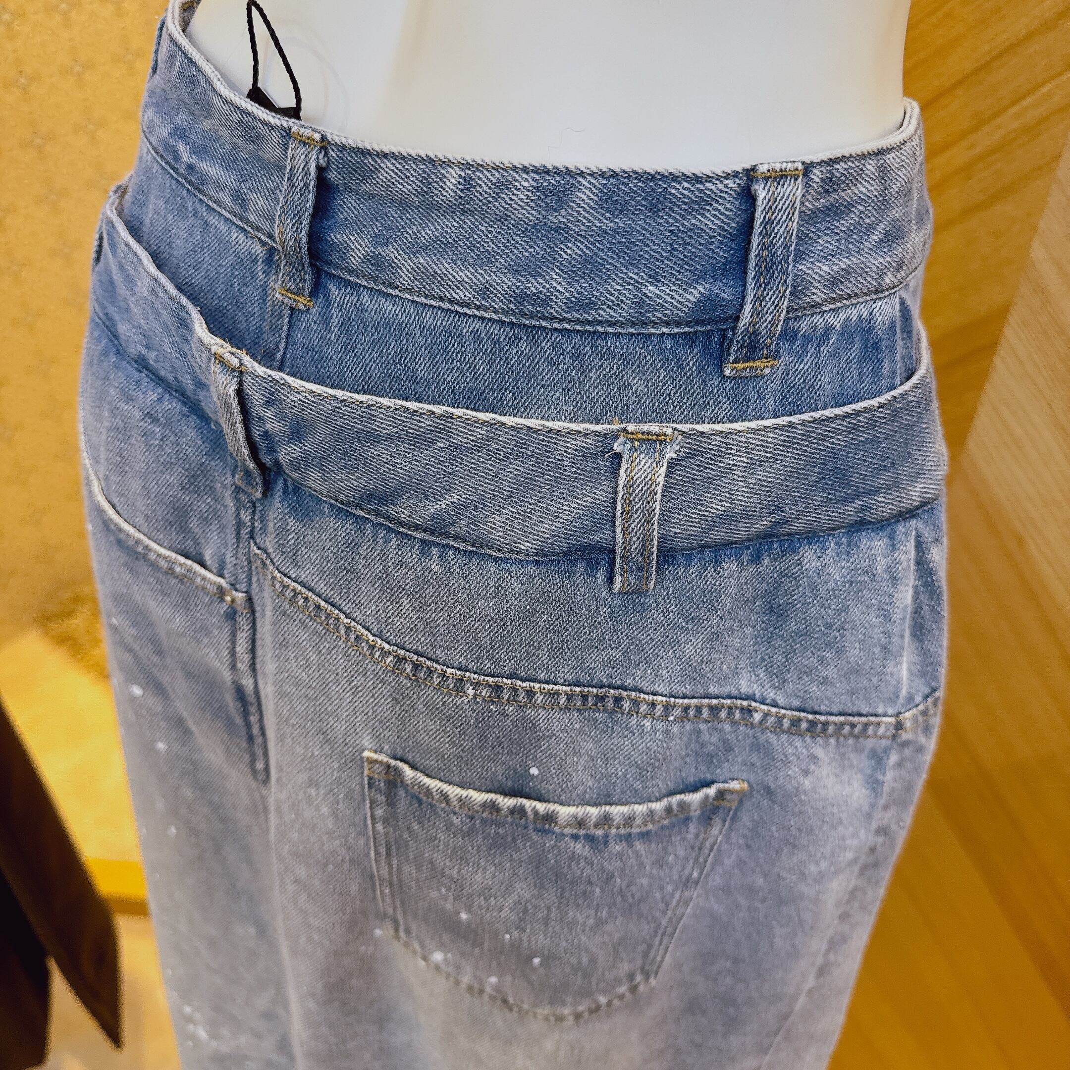 ブリーチ加工で色を落とし薄くベージュのオーバーダイをのせて、ペンキが飛んだように顔料を散らしてヴィンテージライクにしたのもポイント。