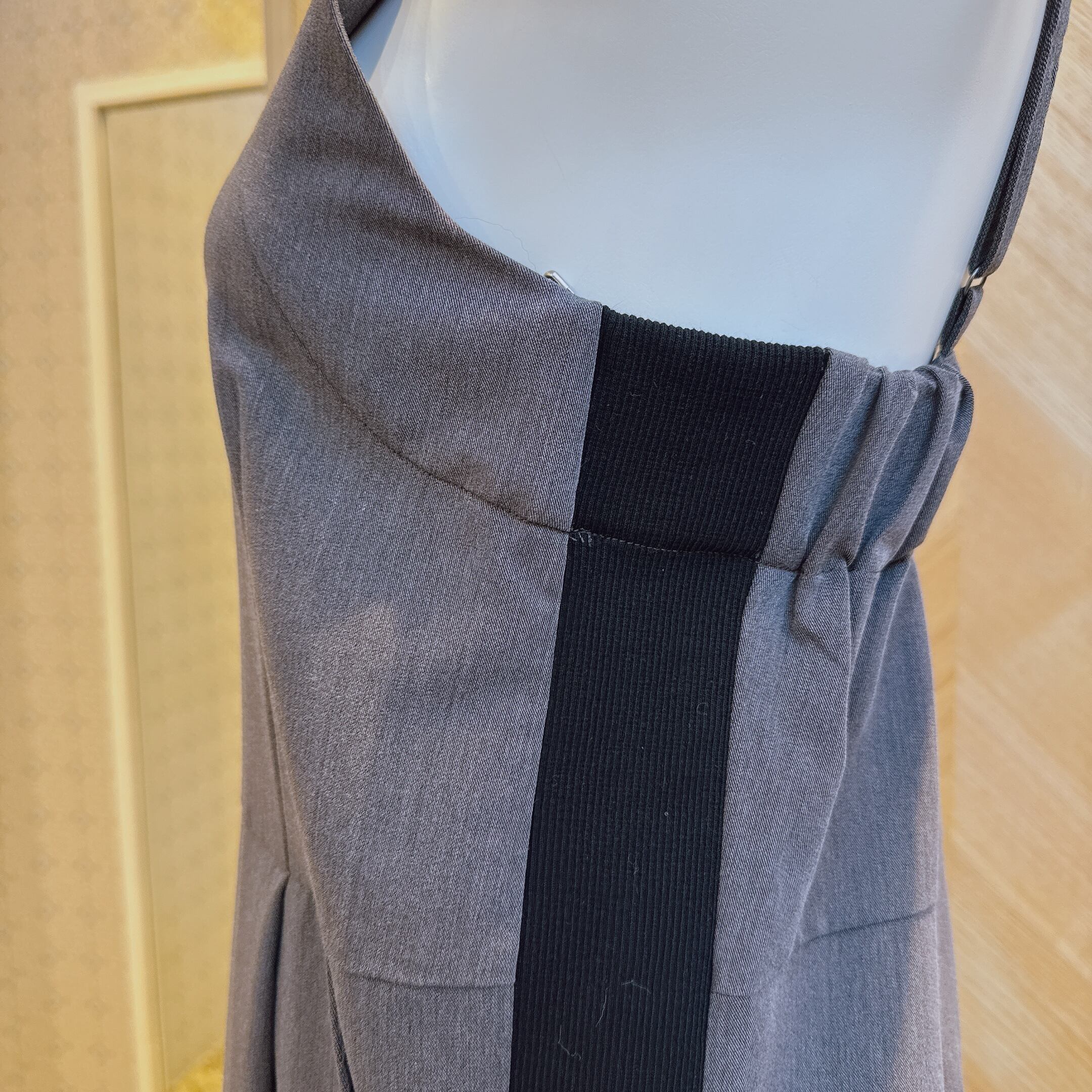 ストレッチの効いた素材に、バックはゴム仕様の為、ファスナーもなく着脱可能なサロペットです。