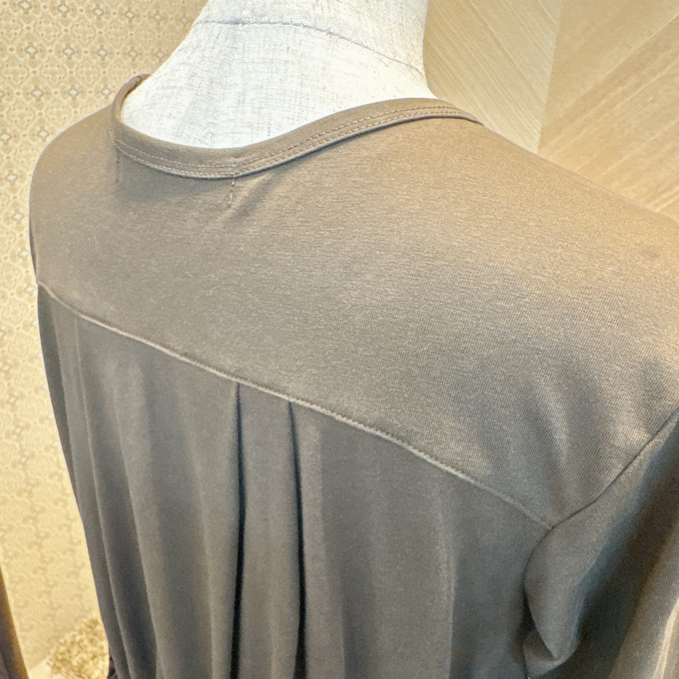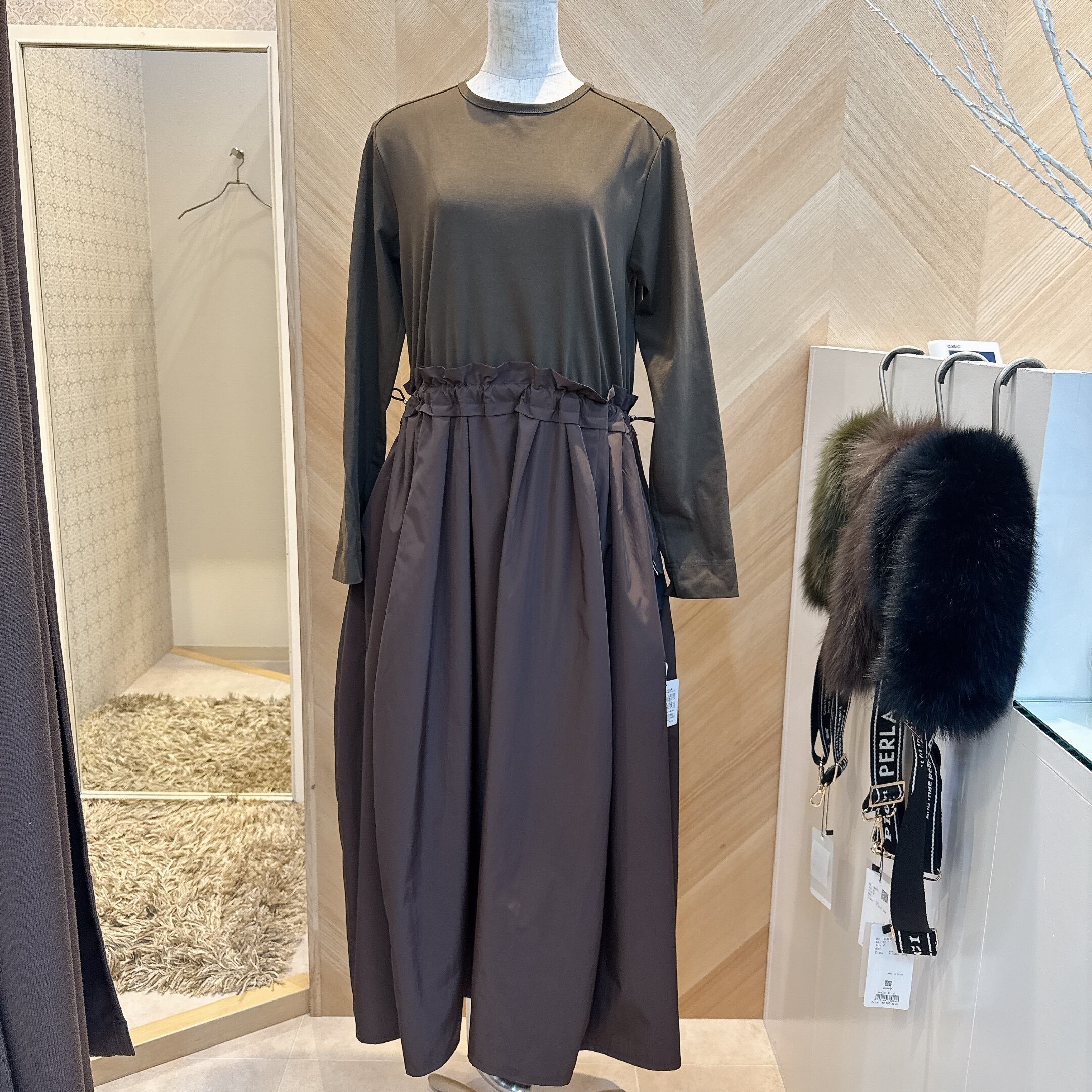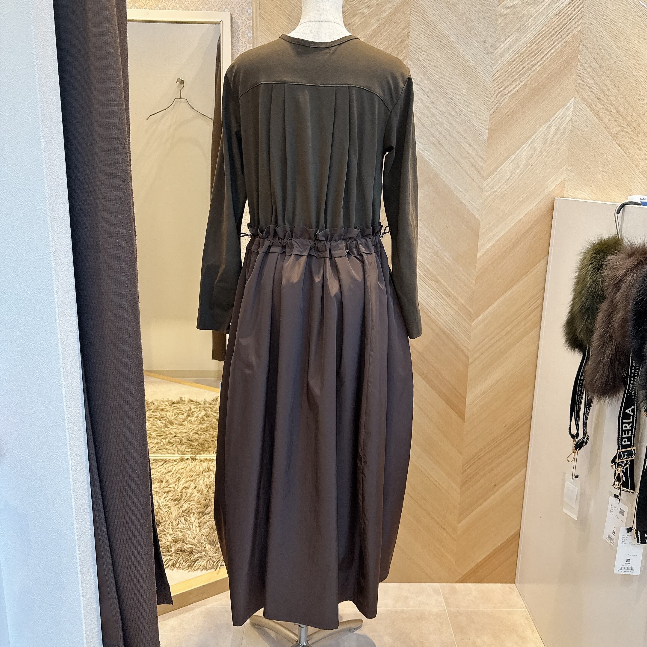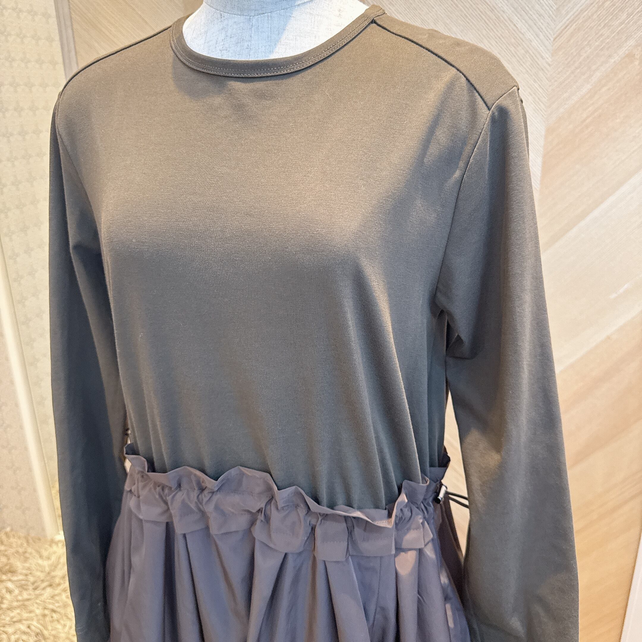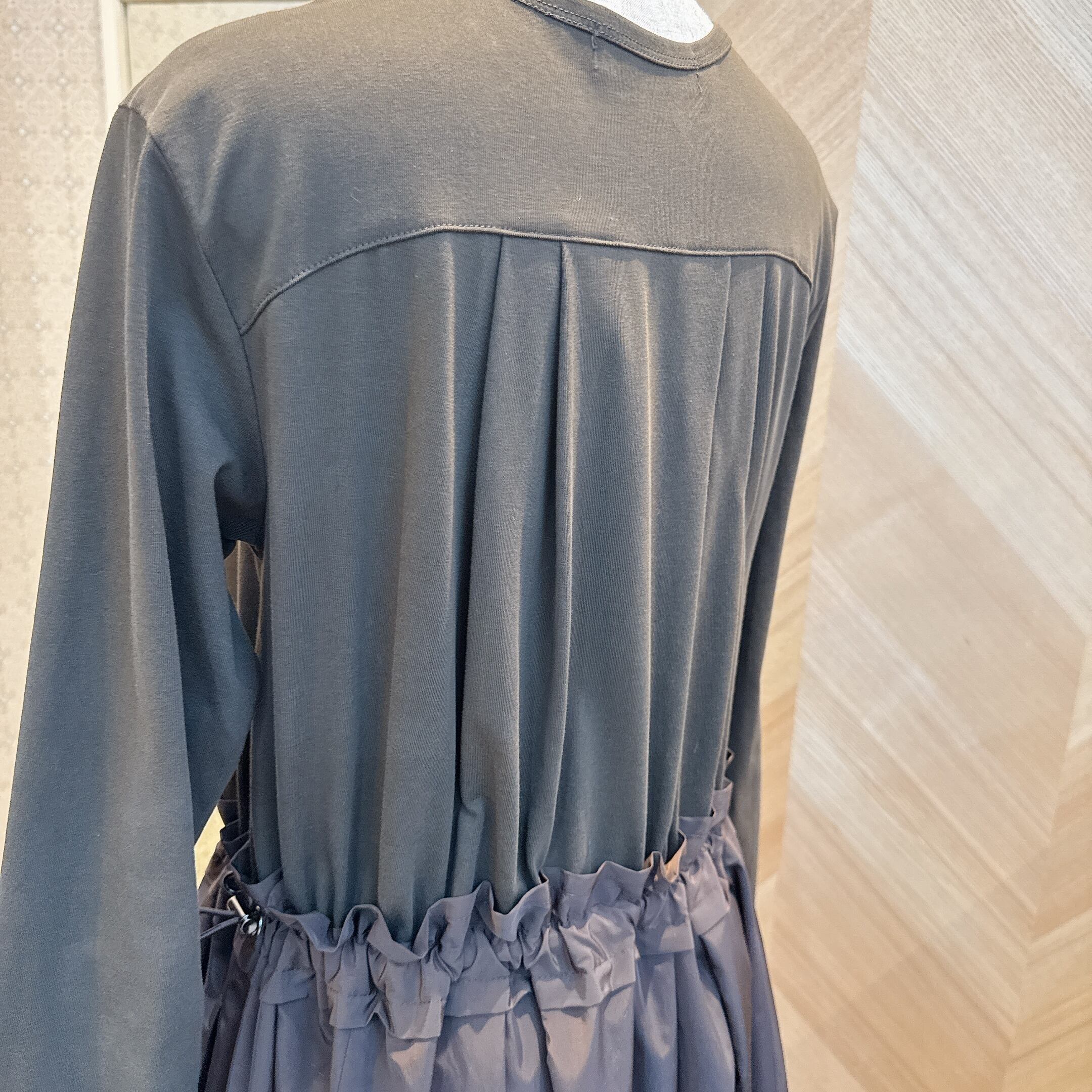 カットソー素材とタフタ素材がドッキングした、ウエストギャザーワンピース。