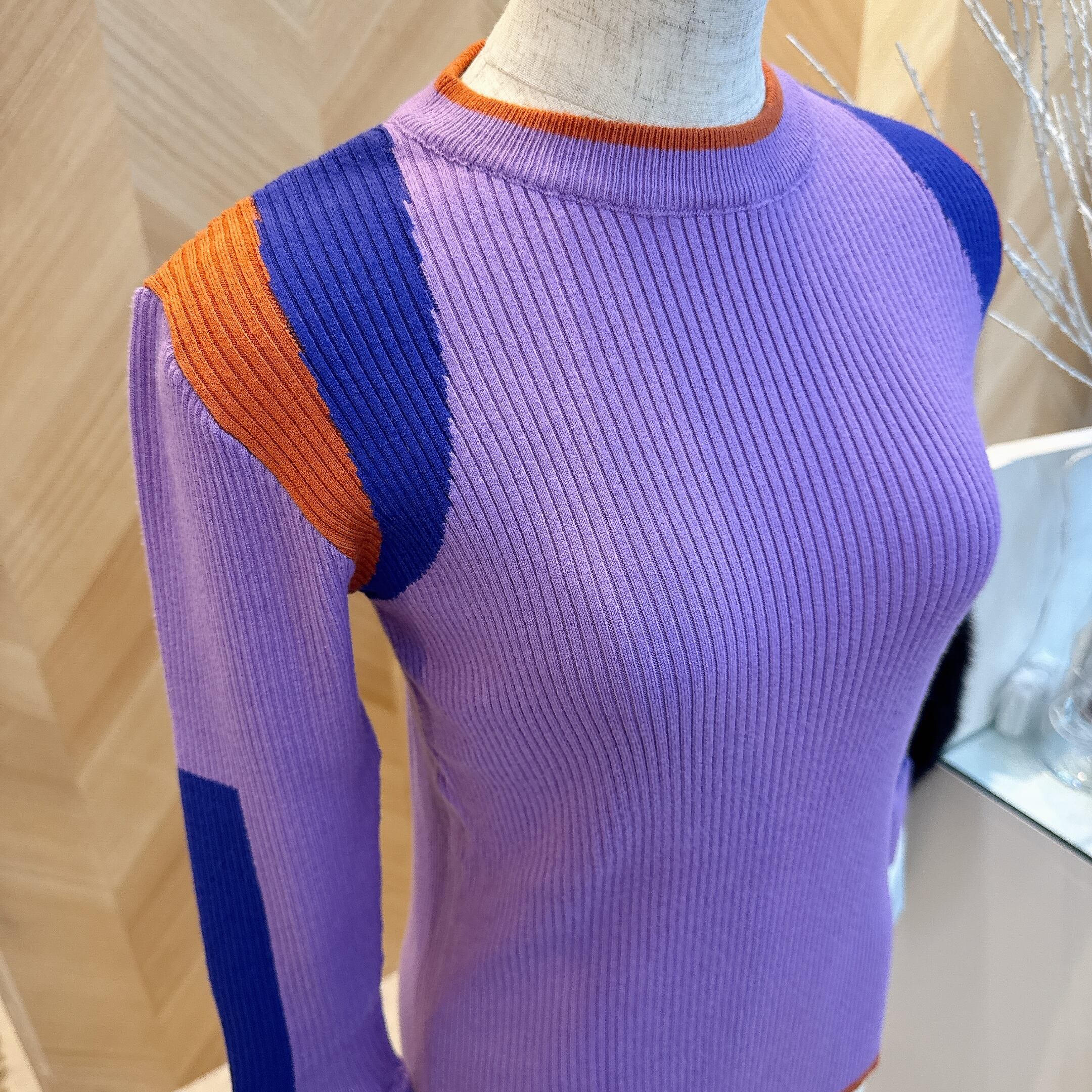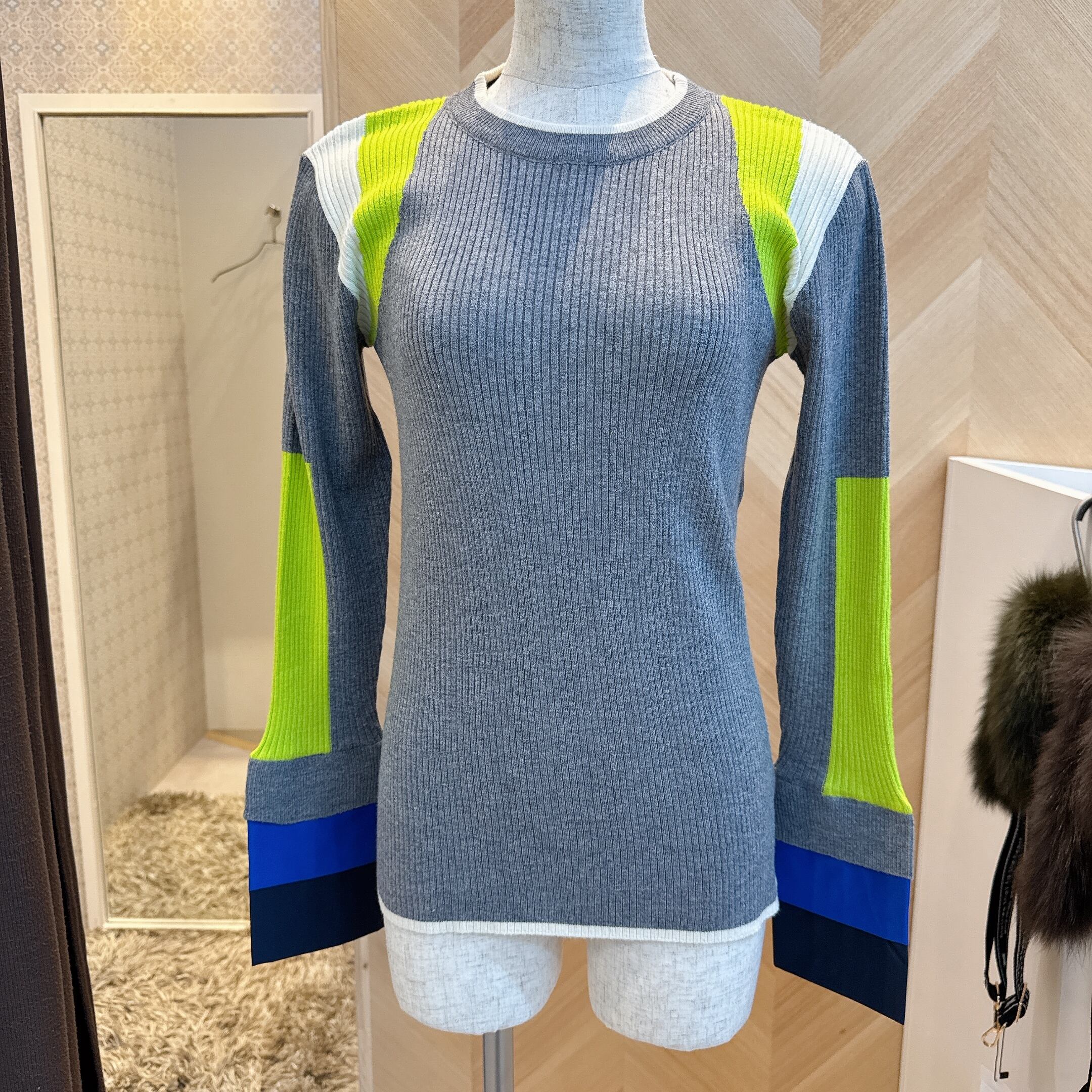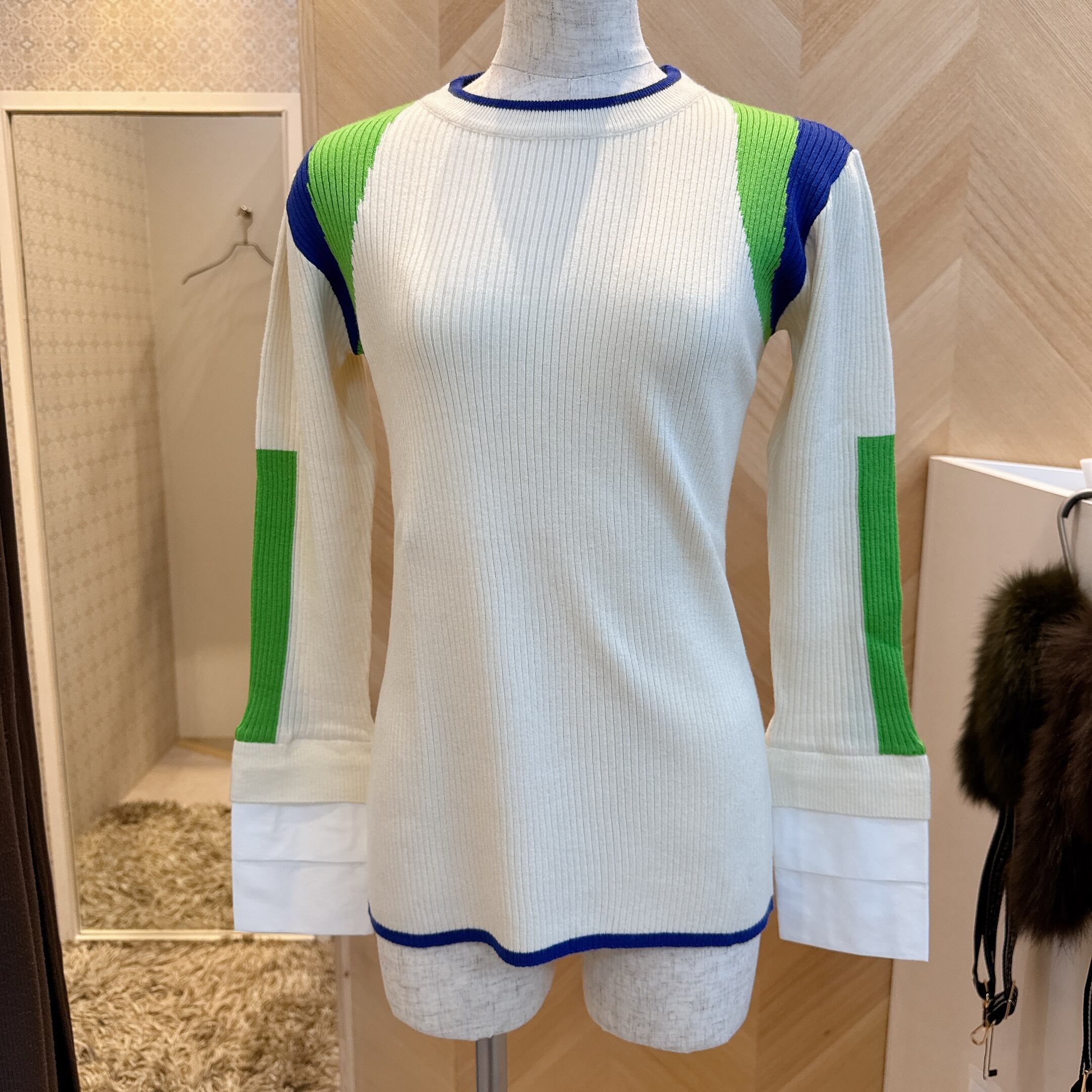 袖や肩の配色が目を引く程よいフィット感のリブニット。