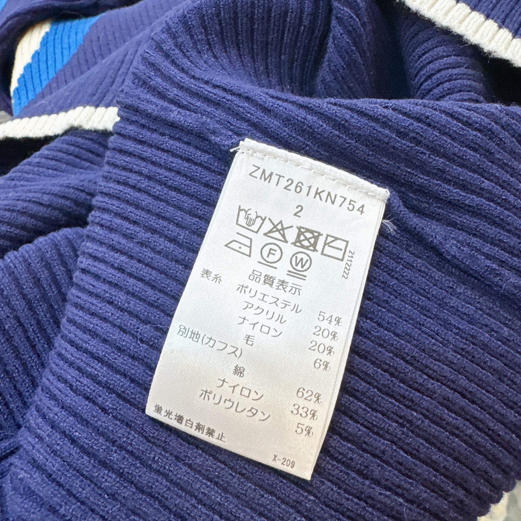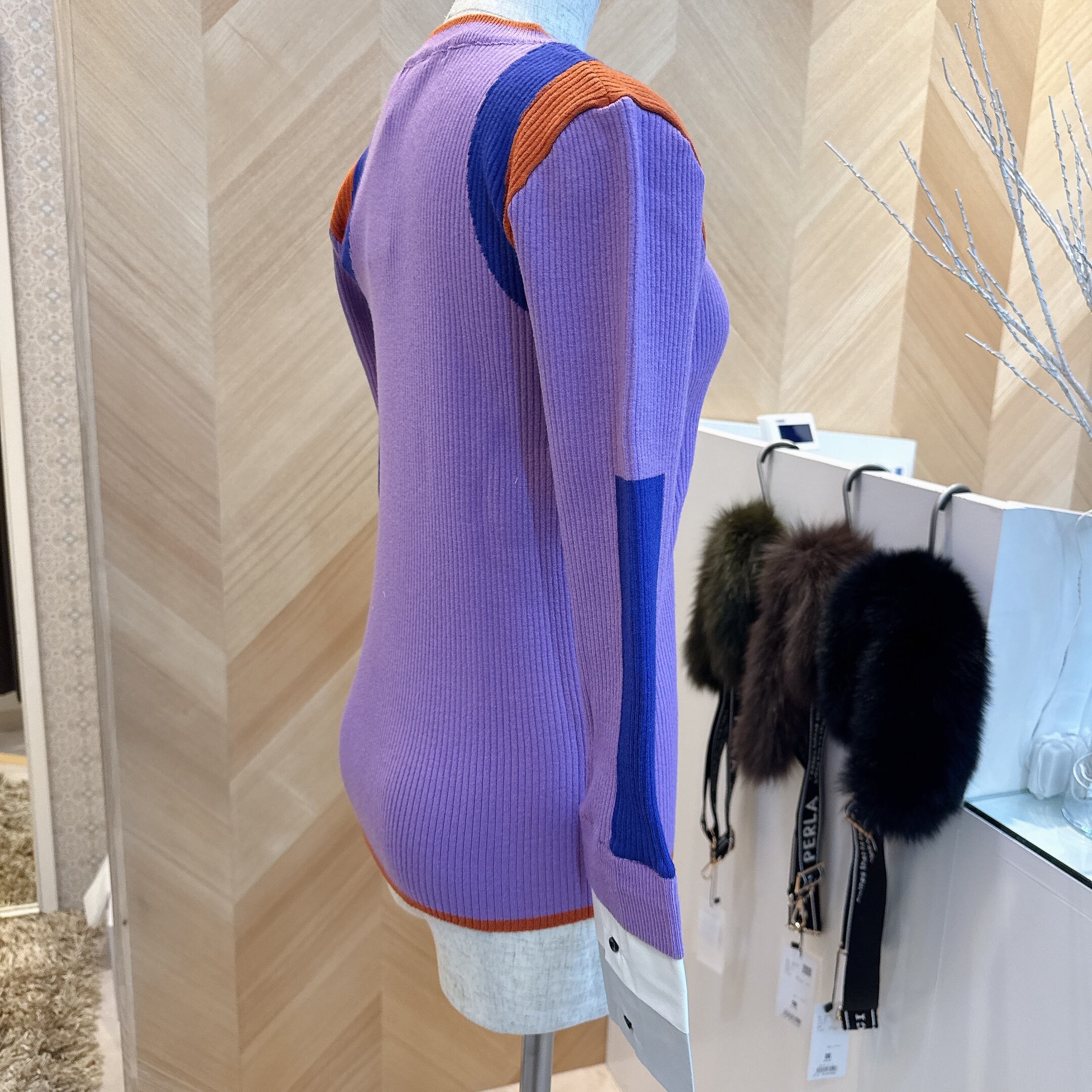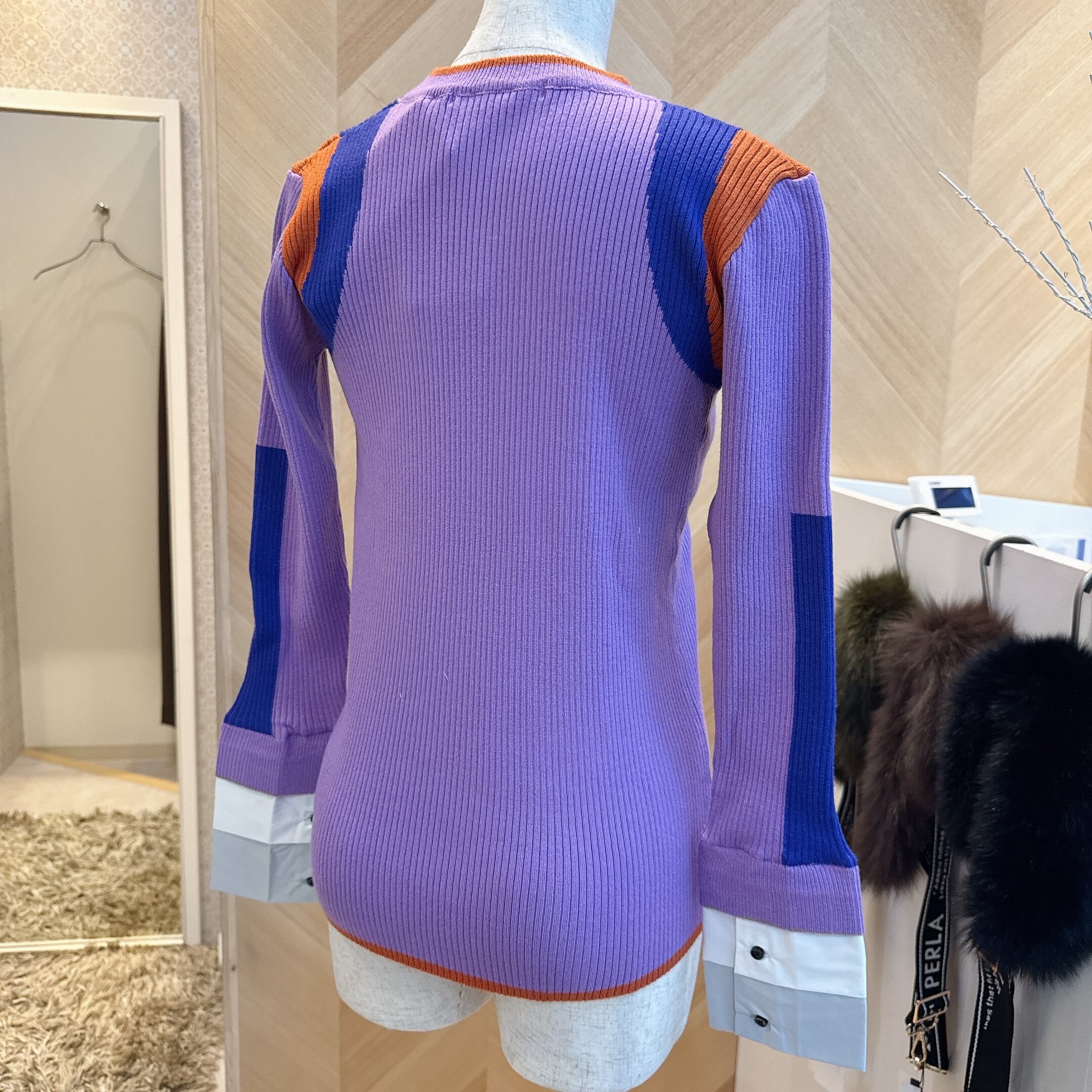 袖や肩の配色が目を引く程よいフィット感のリブニット。