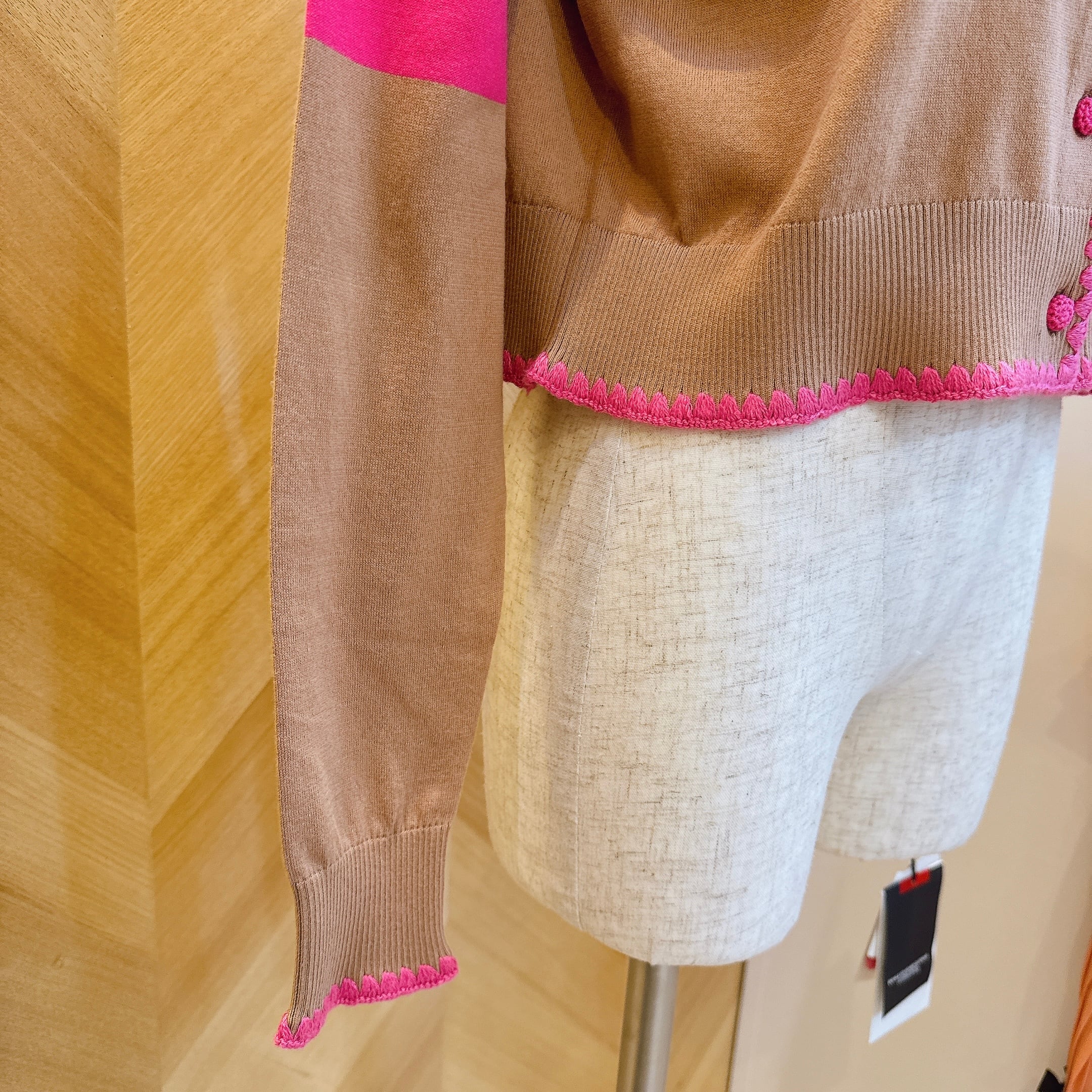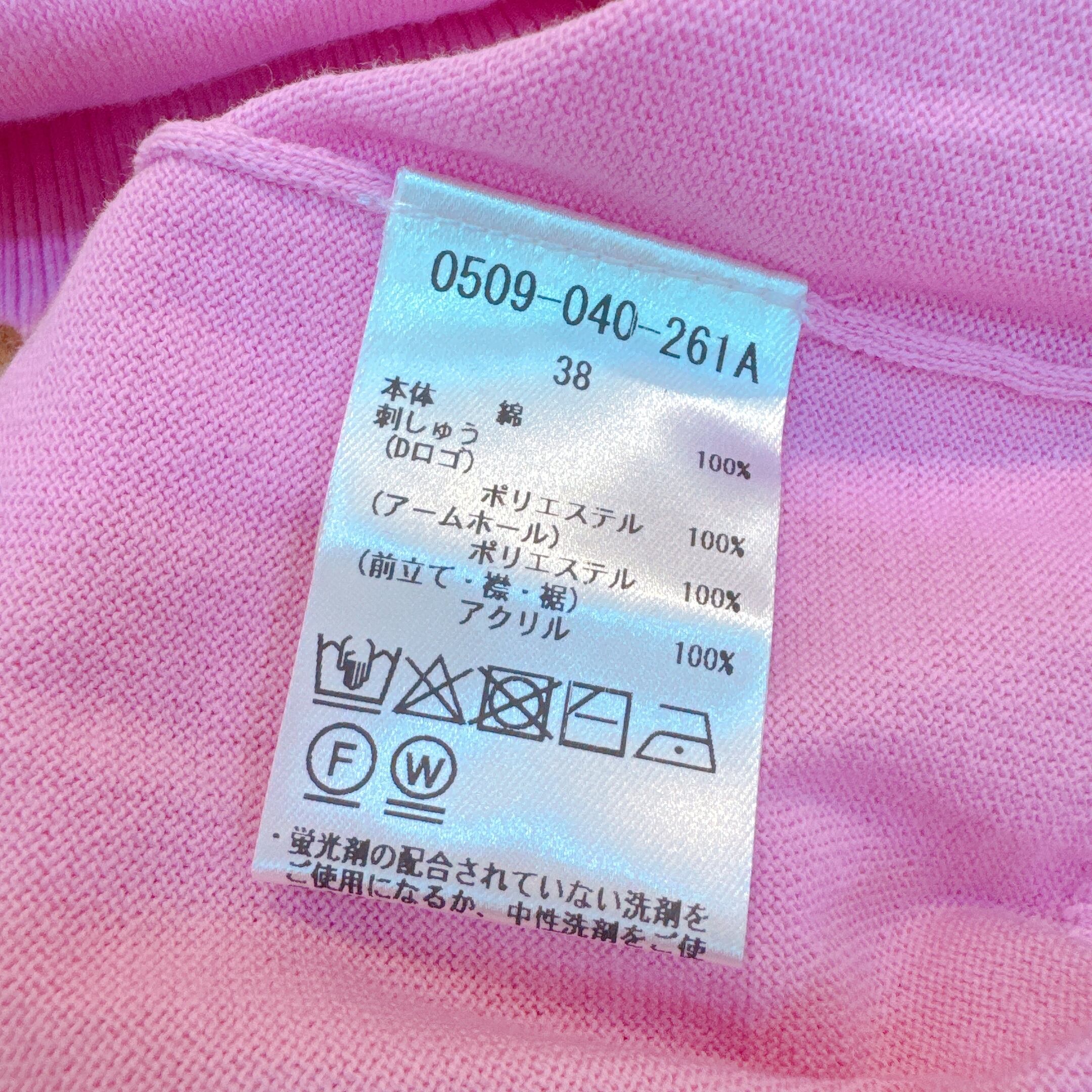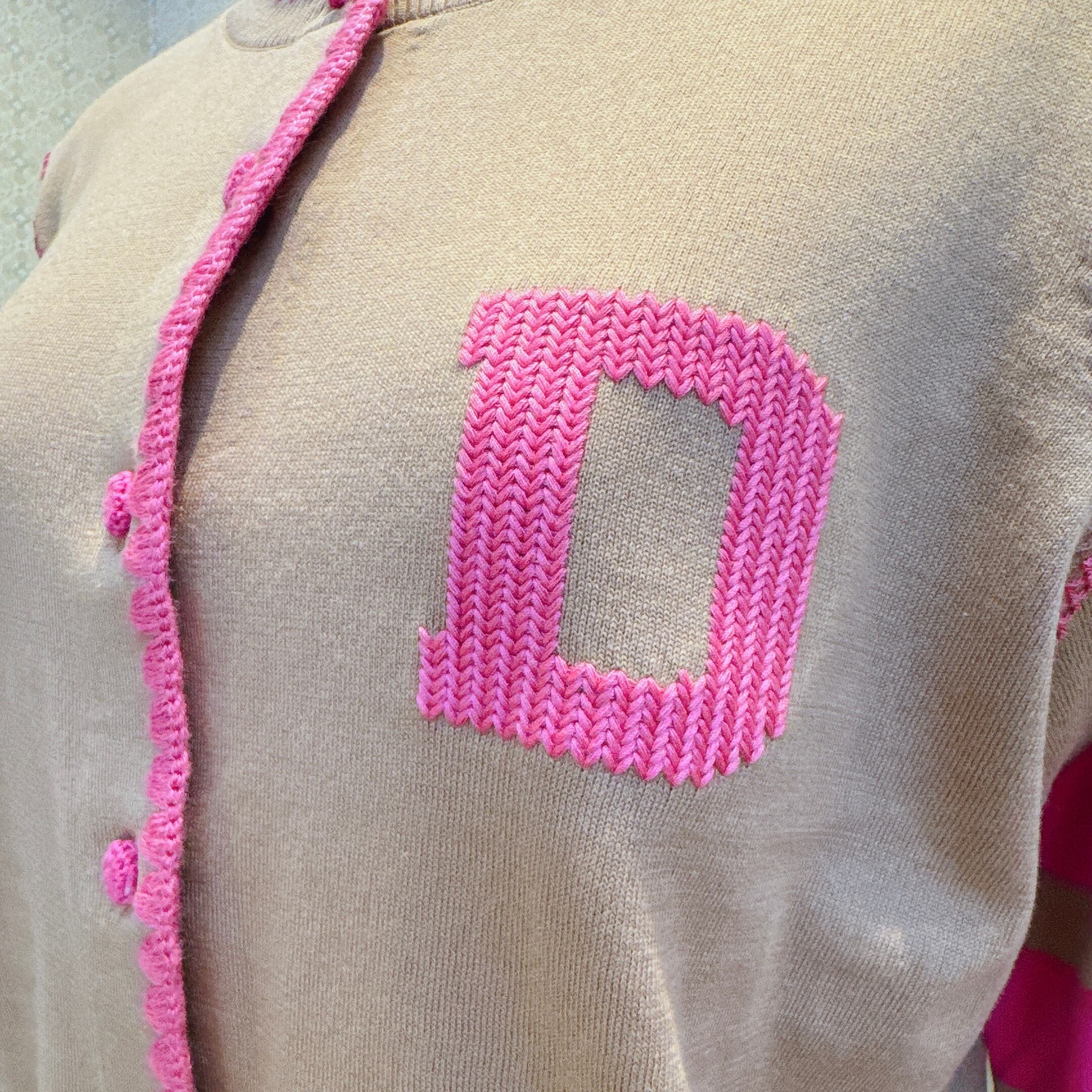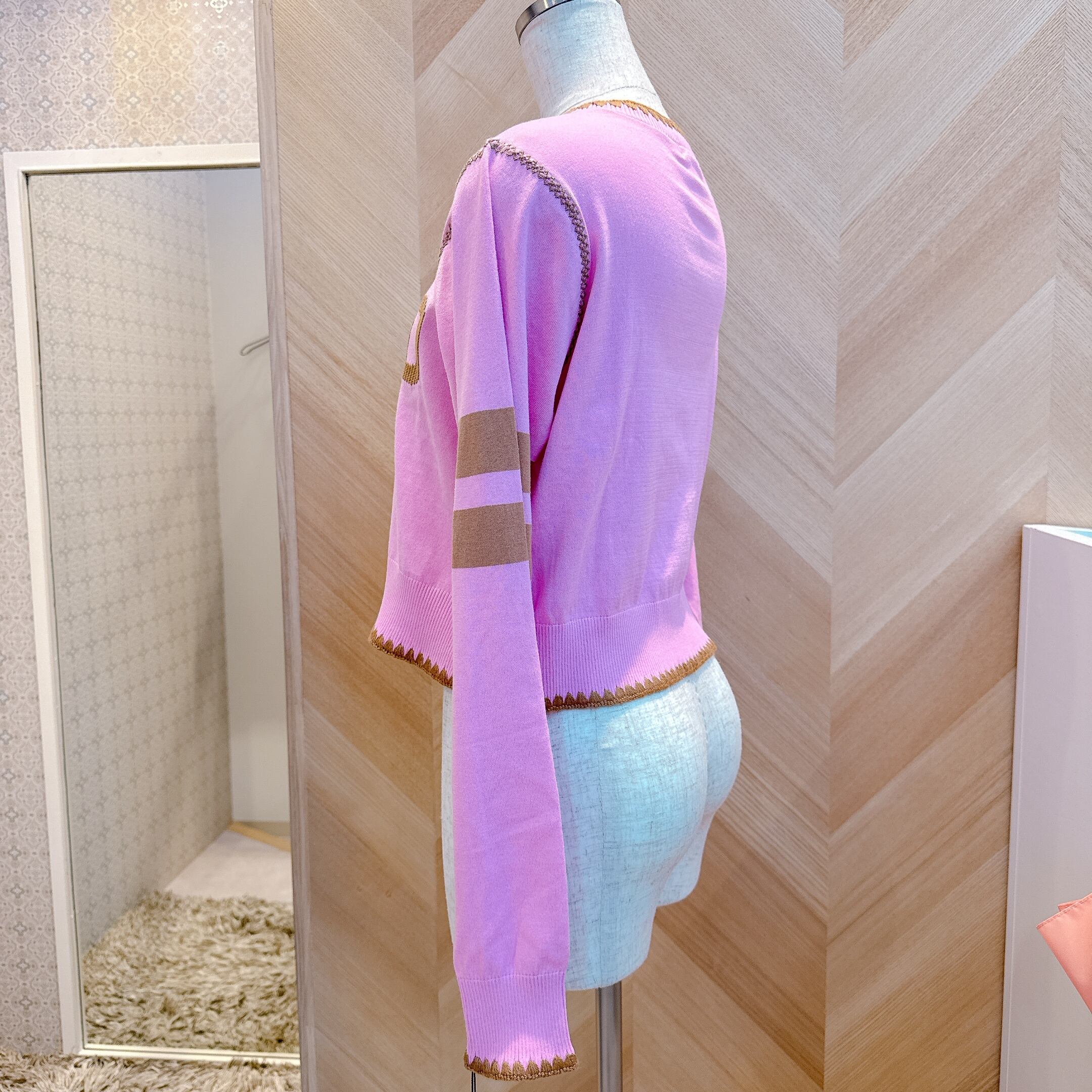 胸元に配した“D”のモチーフと、袖のラインがさりげないデザインアクセントになっています。ピンクとキャメルのカラーリングがガーリーな雰囲気。