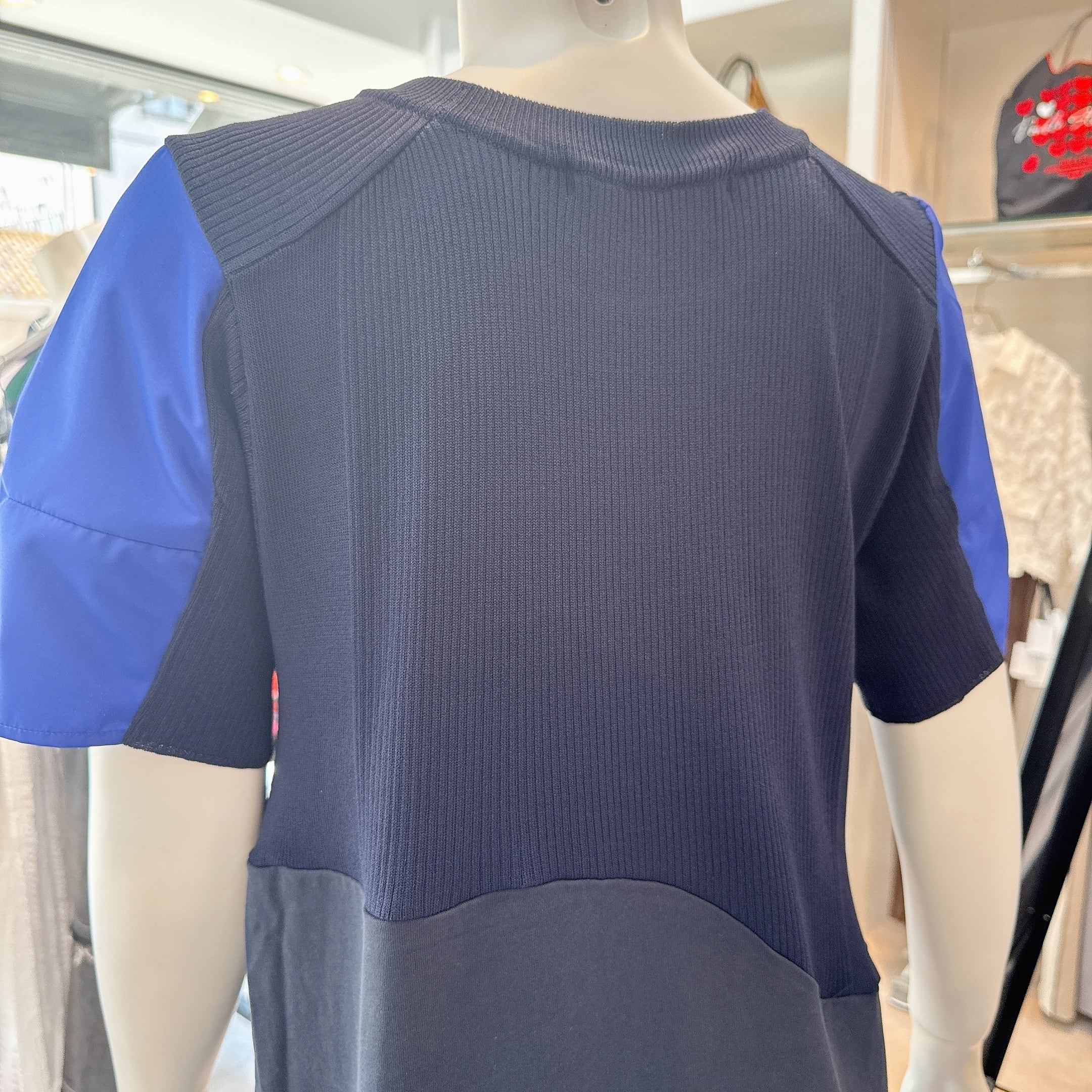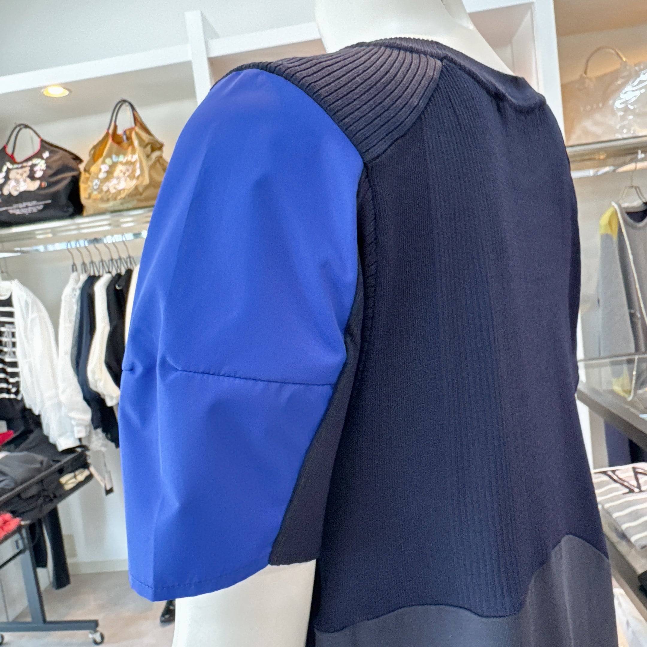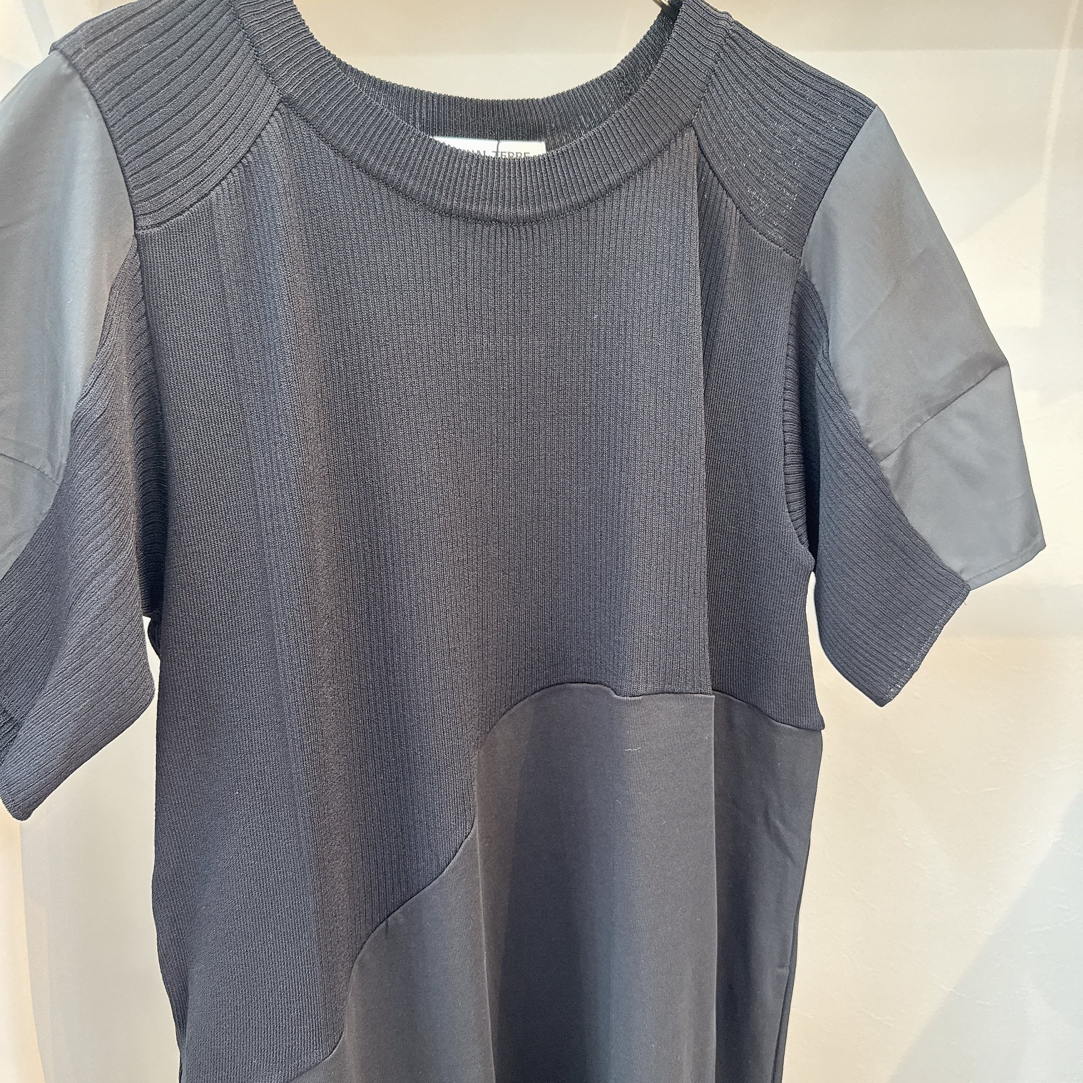 上身頃はやわらかなニット、身頃は着心地の良い天竺、裾はハリのあるタフタ素材を使用しています。