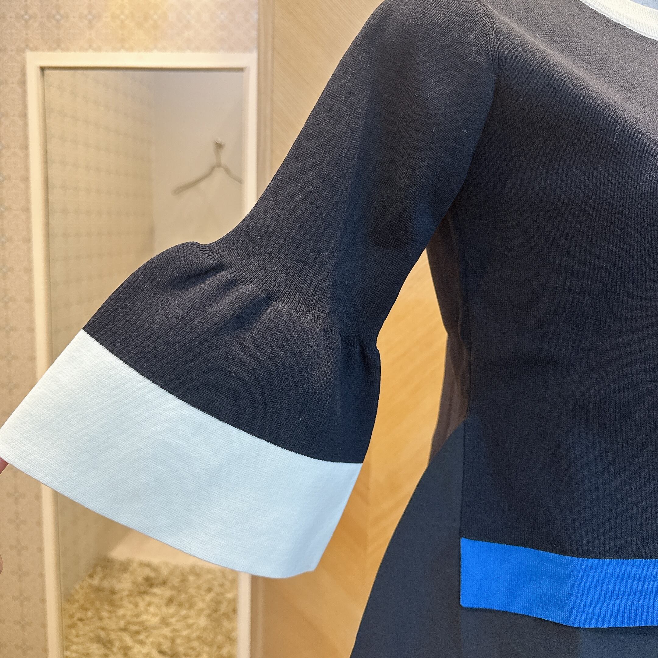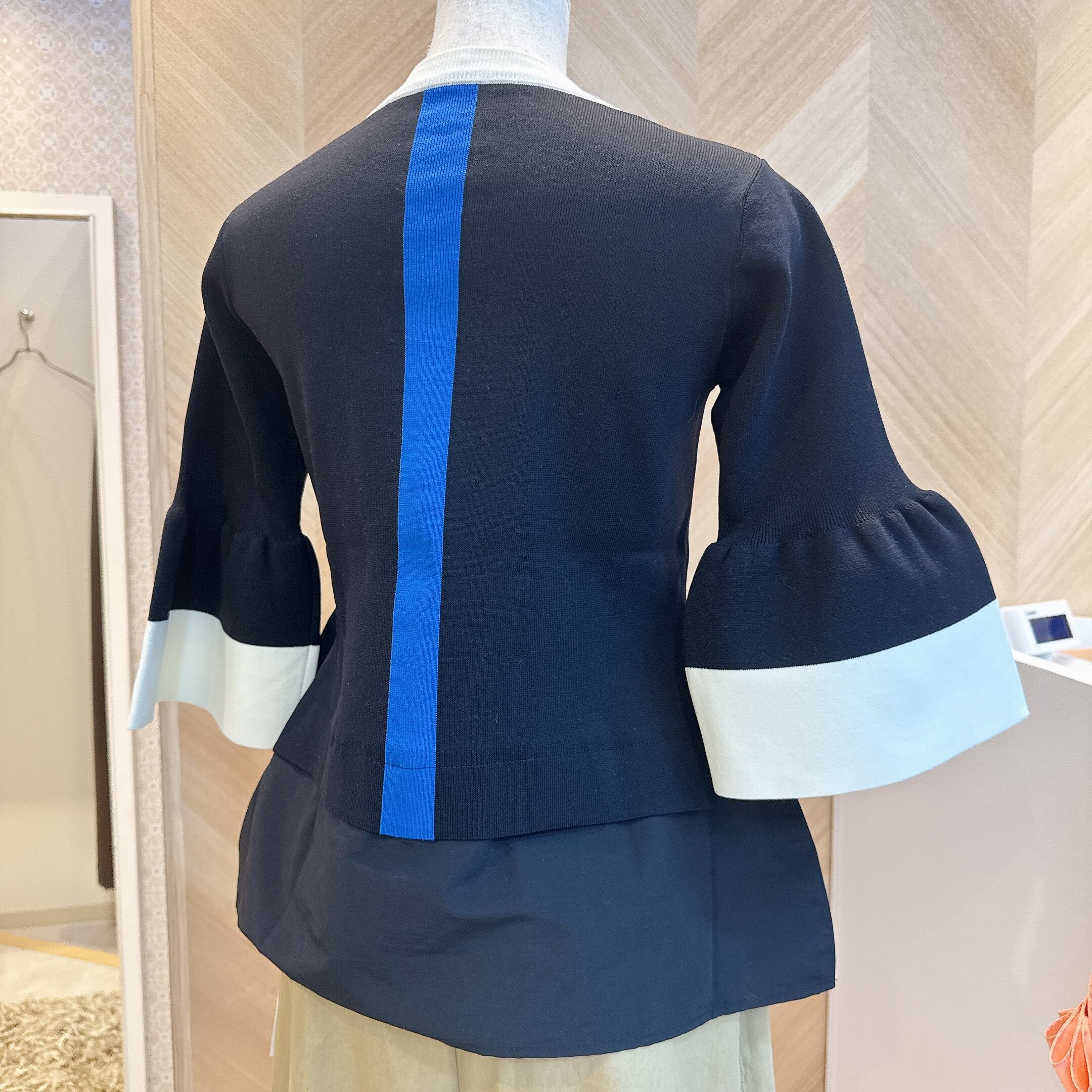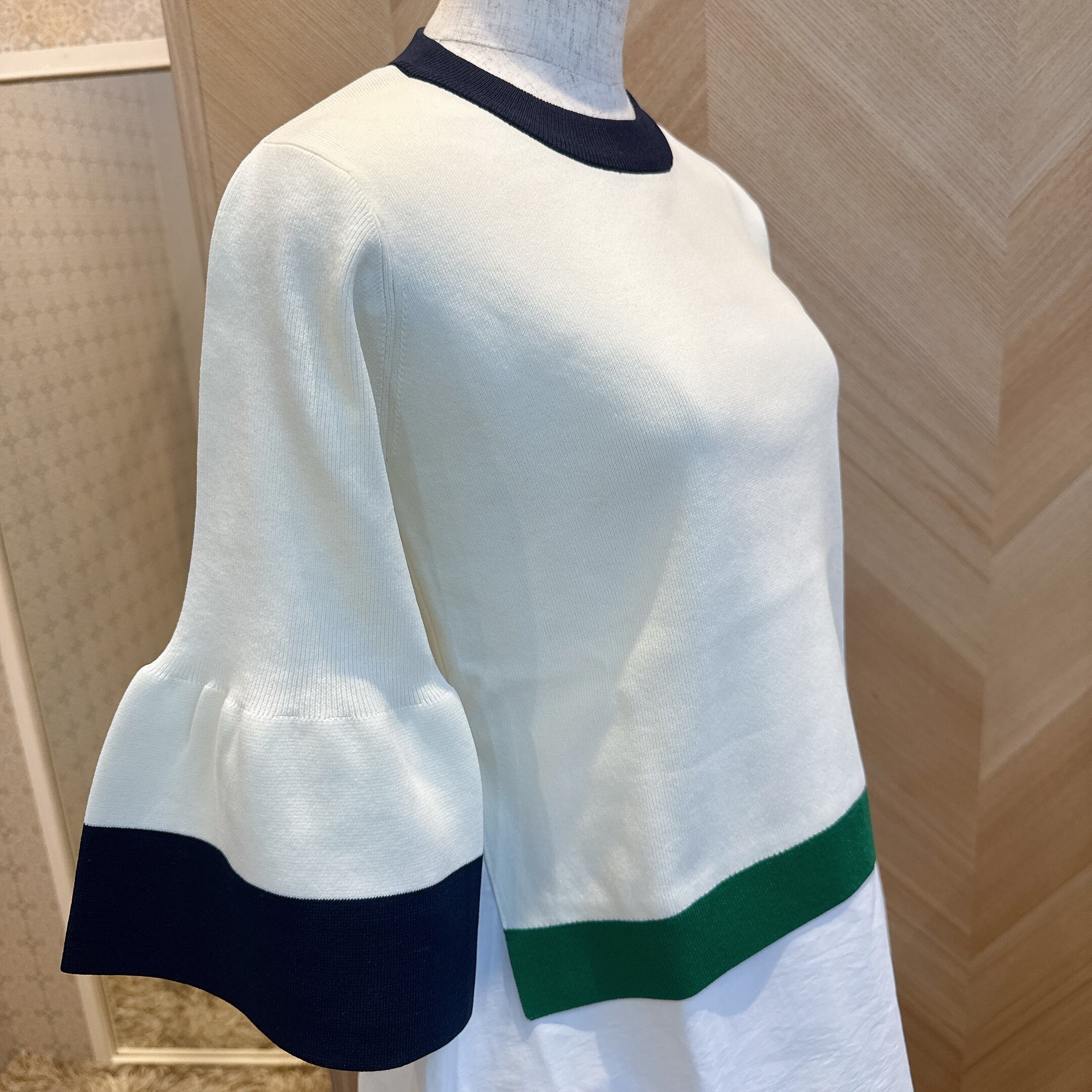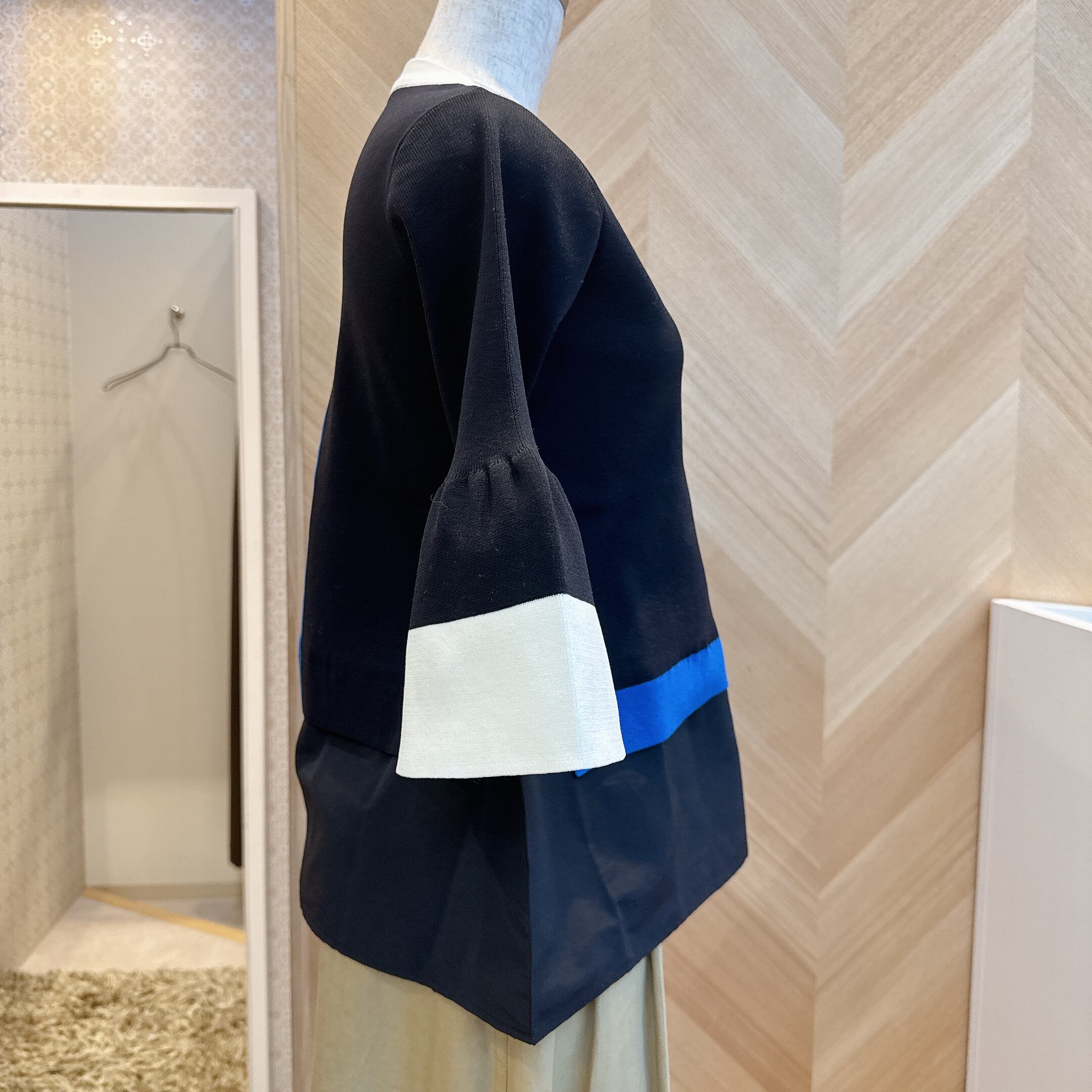 配色デザインとベルスリーブが軽やかな抜け感を演出し、7分袖でロングシーズン活躍。